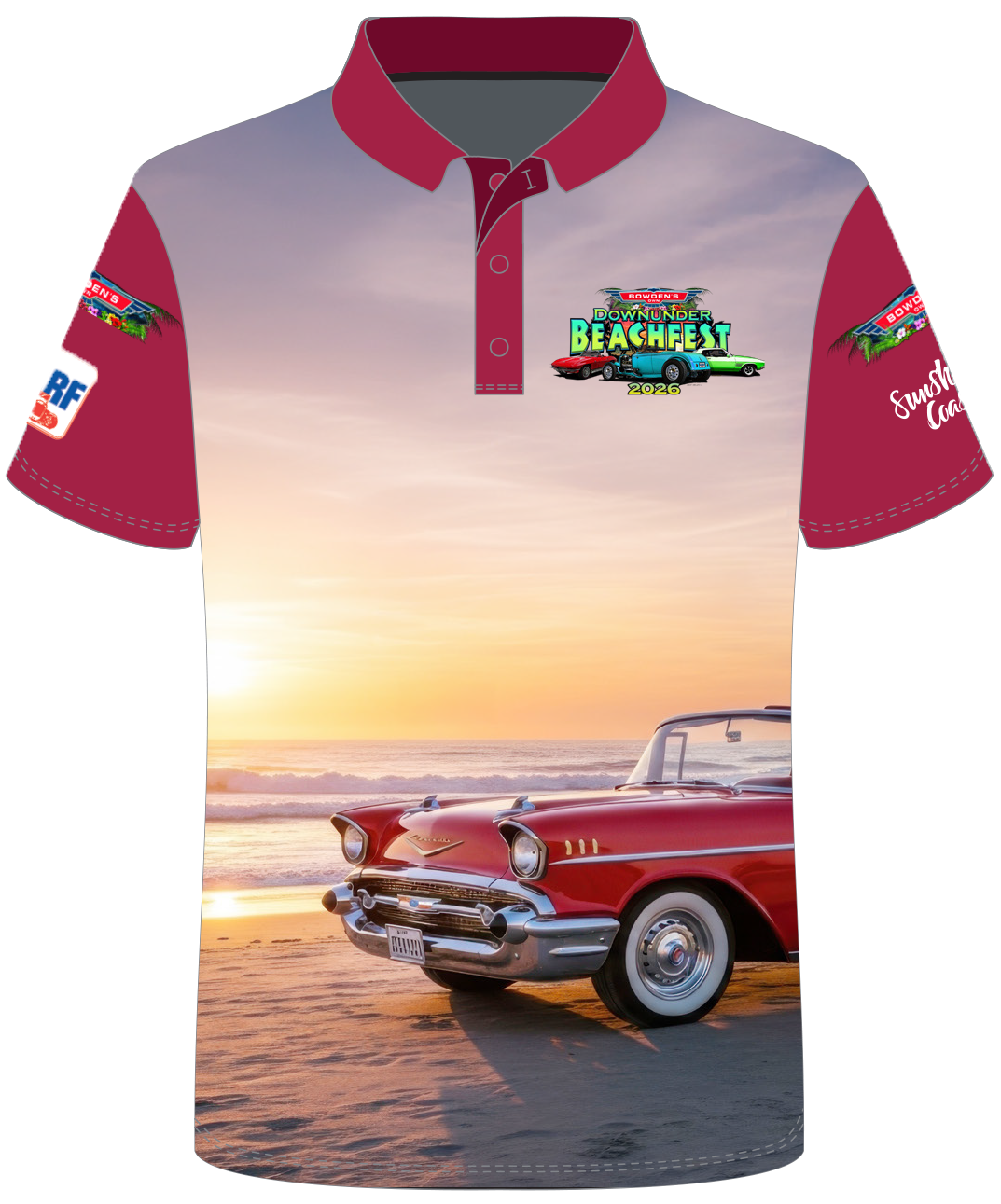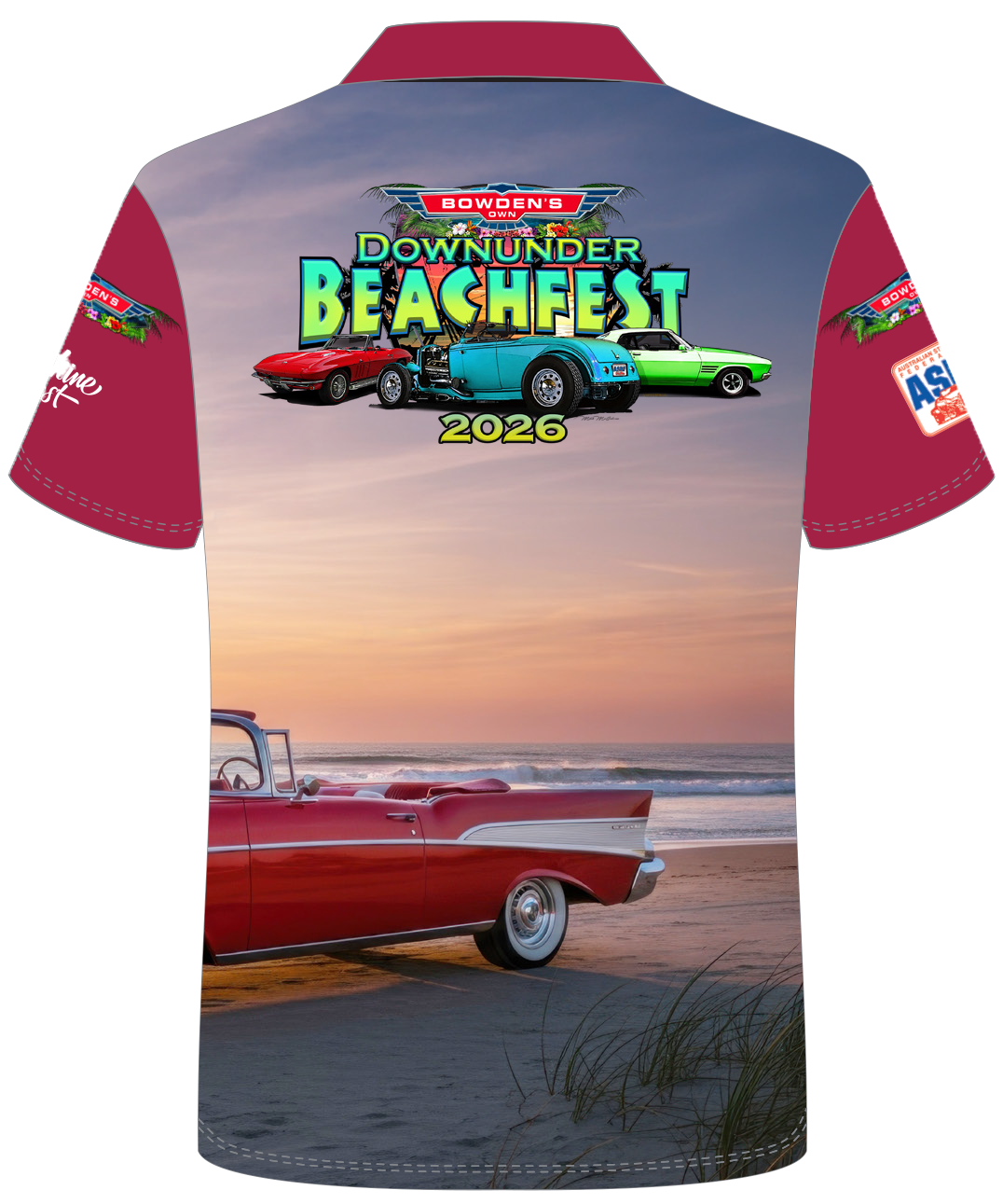 The 2026 Downunder Beachfest Exclusive Sublimated Cotton Shirt features a unique design, premium comfort, and inclusive unisex sizing (XS-XXXXL). Perfect for car enthusiasts and festival lovers!